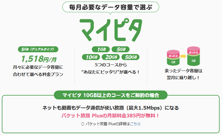 - 基本データ容量で選ぶ「マイピタ」、通信速度で選ぶ「マイそく」が選べる
