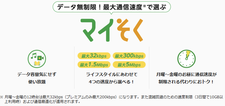 マイそくは、月曜~金曜の12時台は通信速度が最大32kbps(プレミアムのみ最大200kbps)になります。また混雑回避のための速度制限(3日間で10GB以上利用時)および通信最適化が適用されます。